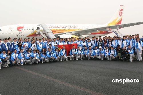 4月1日,剛剛從希臘運送圣火火種回京的圣火包機“奧運圣火號”再度起飛,攜圣火火種前往哈薩克斯坦的阿拉木圖。北京奧運會圣火將從那里開始境外傳遞的首航。北京時間四月二日,奧運圣火將在阿拉木圖進(jìn)行六個小時的傳遞。圖為北京奧運火炬?zhèn)鬟f運行團隊在包機前合影。中新社發(fā) 沈晨 攝