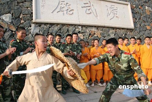 4月6日,武警福建泉州支隊(duì)四中隊(duì)官兵們與駐地南少林武僧進(jìn)行了一場(chǎng)“武林爭(zhēng)霸”賽活動(dòng)。通過(guò)活動(dòng),官兵們既增加了對(duì)中國(guó)傳統(tǒng)少林文化的認(rèn)識(shí)了解,也激發(fā)了愛(ài)警習(xí)武、苦練軍事技能本領(lǐng)的決心。圖為武警戰(zhàn)士與少林武僧“切磋”功夫的情景。中新社發(fā) 張九強(qiáng) 攝