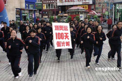 4月29日,新疆電影公司50余名職工手舉“迎奧運(yùn)100天倒計時”牌匾,在新疆烏魯木齊市街頭舉行長跑活動。同時,為期5天的趣味運(yùn)動會也拉開帷幕,其中包括長跑、踩氣球、乒乓球等項目,為即將到來的北京奧運(yùn)會吶喊助威。中新社發(fā) 劉新 攝