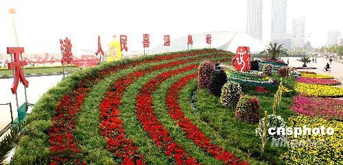 4月30日,天津市有關(guān)部門在銀河廣場(chǎng)擺放的以“天津人民喜迎奧運(yùn)”為主題的巨型花壇亮相,使銀河廣場(chǎng)更靚,給即將到來的“五一”節(jié)增添了歡樂、祥和和喜慶氣氛。中新社發(fā) 李勝利 攝