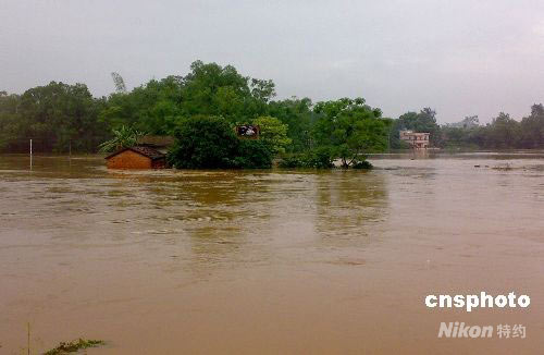 五月四日,廣西部分沿海城市突降暴雨,大雨滂沱數(shù)小時,降雨量竟達(dá)全年平均降雨量的五分之一,造成部分地區(qū)出現(xiàn)水澇。圖為廣西北海市合浦縣白沙鎮(zhèn)五里牌村被洪水淹沒的房屋。中新社發(fā) 羅毅強 攝