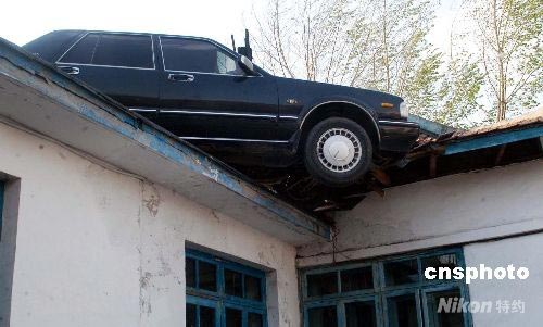 5月6日,在吉林延邊一處公路路面高于兩側(cè)房屋的特殊路段,一輛轎車被大風(fēng)吹到路邊低處房屋的屋頂上。當(dāng)日,吉林省延邊州遭大風(fēng)突襲,瞬時(shí)最大風(fēng)力達(dá)到十一級,為延邊歷史上少有。中新社發(fā) 秦俑 攝