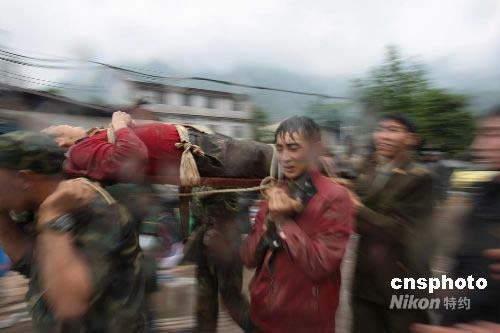 5月13日,中國空降兵6500多名官兵分別乘坐空軍遠(yuǎn)輸機(jī)奔赴四川重災(zāi)區(qū),分五路兵力,分別在什邡、德陽、茂縣、等重災(zāi)區(qū)展開救援。圖為解放軍士兵成功救出一名傷者。中新社發(fā) 譚超 攝