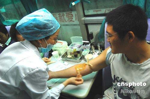 5月14日,重慶市西南大學(xué)育才學(xué)院近500名同學(xué)冒著大雨排隊獻血。重慶市合川區(qū)血液中心來到校園進行采集血液,引起了大量學(xué)生的踴躍報名獻血,場面一度失控。同學(xué)們血脈相通汶川,紛紛表示了對災(zāi)區(qū)人民的慰問之情。血液中心負責(zé)人介紹說,當天采集了200余名學(xué)生的血液,將馬上運送到最需要的災(zāi)區(qū)。中新社發(fā) 許康平 攝