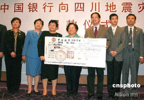 5月14日,中國銀行在北京舉行捐贈(zèng)儀式,向中國紅十字總會(huì)捐款1000萬元人民幣,用于汶川地震災(zāi)區(qū)援救工作。中國紅十字總會(huì)會(huì)長(zhǎng)彭佩云代表協(xié)會(huì)接受捐款。至此,中國銀行集團(tuán)已向?yàn)?zāi)區(qū)捐款近2300萬元人民幣,是目前對(duì)此次抗震救災(zāi)捐款數(shù)額最大的企業(yè)。中新社發(fā) 廖文靜 攝