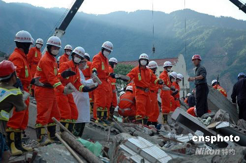 5月15日,重慶消防官兵在四川地震重災(zāi)區(qū)北川縣北川中學現(xiàn)場清理廢墟上的磚塊,尋找幸存者。中新社發(fā) 萬明 攝