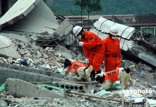5月15日,四川地震重災區(qū)北川縣,重慶消防官兵動用搜救犬在北川中學廢墟中搜尋幸存者。中新社發(fā) 萬明 攝