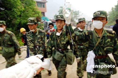 五月十六日晨,解放軍某部官兵在地震重災區(qū)北川縣茅壩小學搜救出三名小學生,這已是地震災難進入第五天在廢墟里搜救出的幸存者。中新社發(fā) 陳文 攝