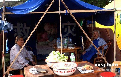 圖:都江堰市老人在簡(jiǎn)易地震棚中生活