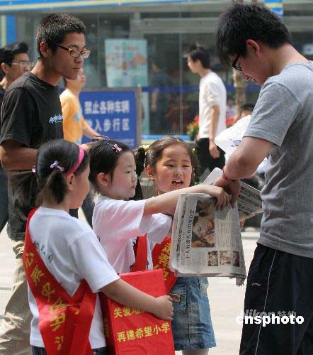 圖:南京兒童義賣(mài)報(bào)紙捐助災(zāi)區(qū)小朋友