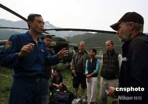五月十八日,三名美國游客和三名澳大利亞游客以及一名丹麥游客從茂縣登上救援的成都軍區(qū)陸軍航空兵某團(tuán)的直升飛機(jī),搭乘王牌飛行員姜機(jī)長的飛機(jī)撤回“天府之國”四川省會成都。這批來九寨溝的游客被困在地震災(zāi)區(qū)己經(jīng)七天,之前先通過軍方的海事衛(wèi)星電話,分別向海外親人報告了平安。 中新社發(fā) 賈國榮 攝
