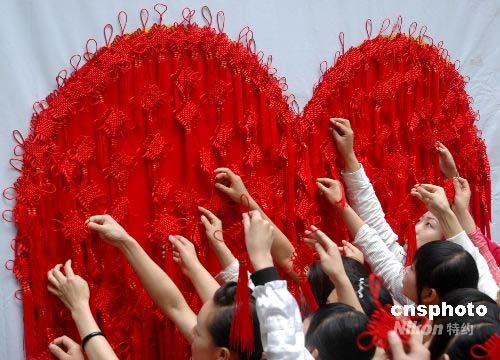 圖:愛心結(jié)掛上祝福墻祝福汶川