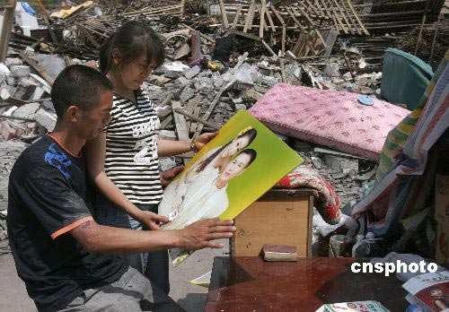 5月19日,四川省什邡市鎣華鎮(zhèn)仁和村三組梁正彬一家正在從廢墟中扒尋自家物品。他們很幸運(yùn),災(zāi)難發(fā)生時,包括老父母和年幼女兒在內(nèi)的全家5口人都跑出了轟然倒塌的房屋!捌桨簿褪歉!”他們默默收拾殘屋,準(zhǔn)備重建家園。中新社發(fā) 張曉理 攝
