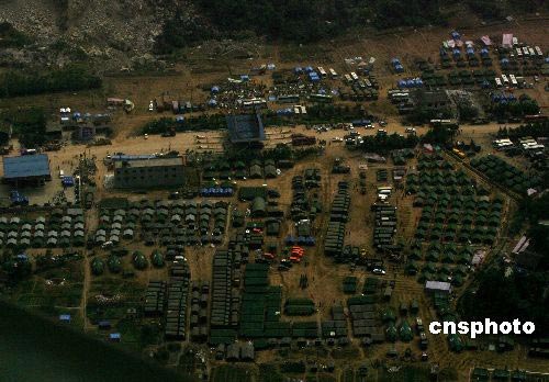 五月二十日,從空中俯瞰北川縣重災(zāi)區(qū)外圍,救援部隊(duì)和縣政府已建立起一座新的帳篷城。中新社發(fā) 賈國(guó)榮 攝