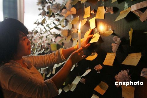在五月十九日到二十一日為期三天的全國哀悼日里,福州寶龍廣場上豎立的兩面以黑色為背景的哀思墻前,許多市民紛紛駐足,悼念四川汶川特大地震遇難同胞。圖為哀悼墻上貼滿人們寫下祝福的紙片、紙花,寄托哀思。中新社發(fā) 小小 攝