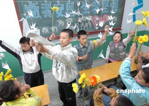 5月21日是全國(guó)哀悼日最后一天,遼寧省錦州市古塔區(qū)培智學(xué)校的300名智障小學(xué)生用雙手疊制了1000只紙鶴,還買來黃菊花悼念地震逝去的小朋友,放飛心愿,為災(zāi)區(qū)人民祈福。中新社發(fā) 李鐵成jz 攝