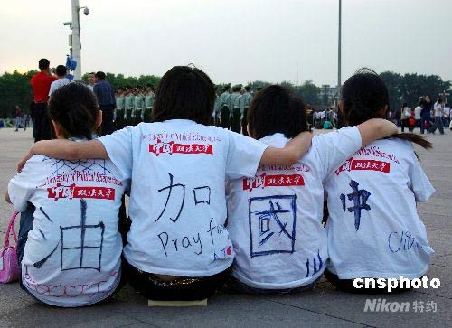 5月21日是全國哀悼日第三天,眾多群眾自發(fā)來到天安門廣場觀看降旗儀式。許多“80后”青年身穿印有“中國挺起”、“中國加油”的文化衫,手持白菊為汶川大地震遇難同胞做最后送別。中新社發(fā) 九州 攝
