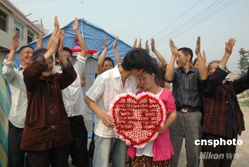 5月22日,在汶川大地震重災(zāi)區(qū)——四川安縣黃土鎮(zhèn)馬村境內(nèi)的臨時(shí)災(zāi)民救助點(diǎn)里,新郎肖建平與新娘熊招鄰舉行了帳篷婚禮。災(zāi)難會(huì)帶給人們創(chuàng)傷,但是無法磨滅人們對(duì)美好生活的向往。中新社發(fā) 涂萍 攝