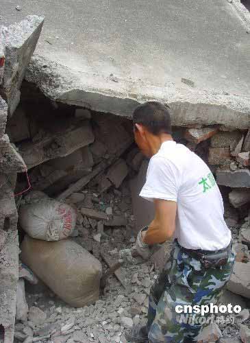 四川汶川大地震幾乎將安縣永安鎮(zhèn)躍進(jìn)村夷為平地,地震后,當(dāng)?shù)卮迕穹e極展開(kāi)生產(chǎn)自救,5月24日上午,村民付作興在自家房屋的廢墟中“搶救”糧食,希望以此減輕政府負(fù)擔(dān)。中新社發(fā) 霍潺 攝