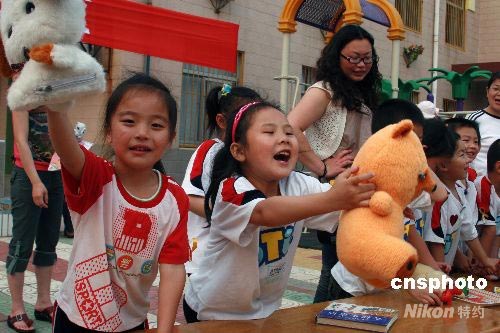 5月28日上午,河南油田五一社區(qū)黃山幼兒園開展“油城飄起黃絲帶,師幼愛心獻災區(qū)”義賣捐款活動。200多名小朋友把自己平時喜愛的玩具、課外書等拿出來義賣,在園內擺起一個個“愛心”小攤。幼兒園將義賣款項做為孩子們“六一”兒童節(jié)的愛心禮物,捐獻給四川災區(qū)的小朋友。中新社發(fā) 李永哲 攝