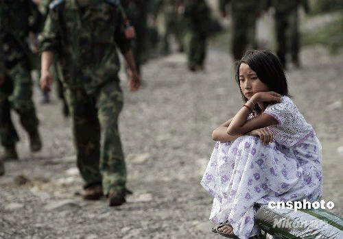 5月28日,四川平武縣南壩鎮(zhèn),一名女孩在災(zāi)后的廢墟中坐在路邊,露出了本不該在這個年齡露出的憂郁,災(zāi)難給災(zāi)區(qū)兒童帶來了巨大的心里創(chuàng)傷。平武縣在5. 12地震中損失慘重,25個鄉(xiāng)鎮(zhèn)18.6萬人全部受災(zāi),90%以上房屋倒塌,截止27日16時,該縣3014人死亡,3555人失蹤。中新社發(fā) 杜洋 攝