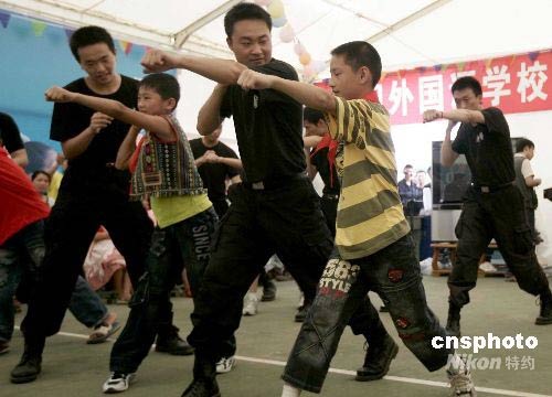 6月1日,在四川綿陽九州體育館受災(zāi)民眾安置區(qū),幾名男孩向特警學(xué)習(xí)軍體拳。中新社發(fā) 杜洋 攝