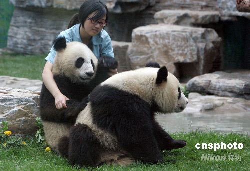 6月2日,一對(duì)雌雄“奧運(yùn)大熊貓寶寶”在北京動(dòng)物園新家依偎在一直照料它們的臥龍女飼養(yǎng)員身邊玩耍。5月24日從四川地震災(zāi)區(qū)運(yùn)抵北京的八只臥龍“奧運(yùn)大熊貓寶寶”,經(jīng)過多日的精心照料已基本從大地震的陰影中解脫出來。從6月5日開始,公眾可以在這里盡情觀賞它們的風(fēng)采。 中新社發(fā) 任晨鳴 攝