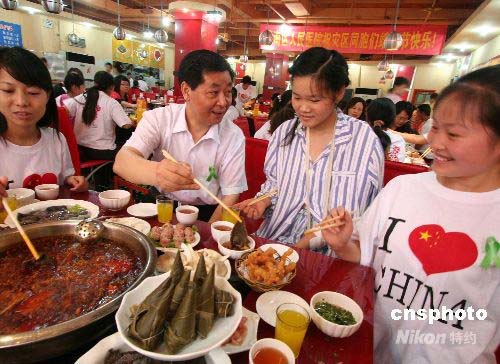 2008年6月8日,在汶川地震中受傷的傷員在重慶巴南區(qū)一火鍋店同當(dāng)?shù)厝嗣襻t(yī)院的醫(yī)護人員一道燙火鍋吃粽子,共度端午傳統(tǒng)佳節(jié)。中新社發(fā) 賀終榮 攝