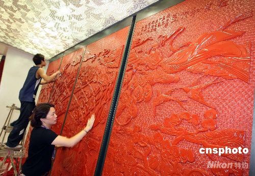 六月十六日,由北京漆寶齋錦麗漆藝工作室設(shè)計制作的奧運(yùn)主會場“鳥巢”貴賓廳“盛世和諧圖”移動式屏風(fēng)等漆藝作品設(shè)計制作基本完成,施工人員在做最后的調(diào)整與修飾。