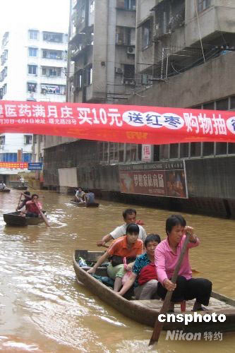 六月十六日,西江水已超警戒水位六點(diǎn)五米的洪峰流經(jīng)廣東封開后,封開舊城區(qū)仍被水淹,居民出行只能以舟代步。中新社發(fā) 黃耀輝 攝