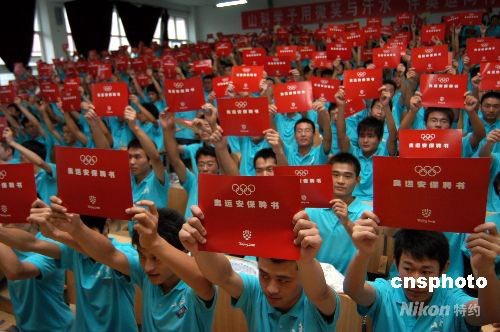 7月9日,山東濰坊的奧運安保志愿者展示聘書。當日,山東科技職業(yè)學院的3000名北京奧運會安保志愿者領到“奧運安保聘書”。從5月底開始,山東濰坊科技職業(yè)學院3000名在校大學生經(jīng)過體能、交通知識、消防知識、巡控知識等方面的培訓,達到奧運會安保志愿者的素質要求。這3000名安保志愿者將從7月11日開始,分8批進京,開展安保服務工作。 中新社發(fā) 王志德 攝
