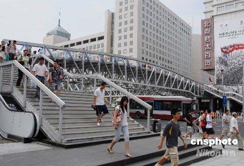 2008年7月20日,行人通過北京西單天橋。當(dāng)天,經(jīng)過改建、新建后的北京西單商業(yè)街區(qū)天橋正式投入使用。西單商業(yè)街改造工程共建新橋兩座、一個(gè)連廊,改建舊橋兩座。其中新1號橋是目前世界上最大的高強(qiáng)度全鋁合金天橋,主橋長84米,寬8米,兩側(cè)四個(gè)方向共8部上行電動(dòng)扶梯,照明系統(tǒng)采用了先進(jìn)的LED燈,美觀、節(jié)能、環(huán)保。中新社發(fā) 耿玉和 攝