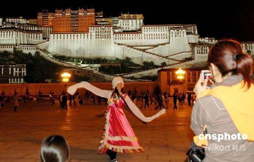 7月26日,游客在布達(dá)拉宮廣場上拍照留念。7月的拉薩綠樹成蔭,鮮花錦簇,在明媚的陽光下,來自世界各地的游客云集,拉薩又到旅游旺季,已經(jīng)走出“3.14”打砸搶燒暴力事件的陰影。據(jù)估計(jì),7月份開放入境游,當(dāng)月旅游人數(shù)將達(dá)到35萬人次。中新社發(fā) 周波 攝