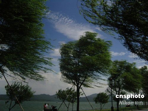 7月28日,山雨欲來風滿樓,受今年八號臺風“鳳凰”的影響,往日寧靜的杭州西子湖畔狂風大作,白堤上的柳樹“狂舞”不斷。中新社發(fā) 柴燕菲 攝