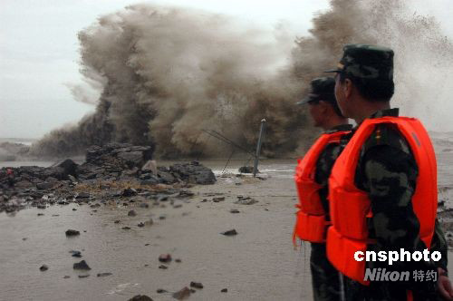7月28日,洞頭邊防官兵在海邊巡邏,巨浪拍擊岸邊激起10多米高的浪花。當(dāng)日傍晚,受今年第8號(hào)臺(tái)風(fēng)“鳳凰”影響,浙江溫州市洞頭海域風(fēng)力大增,攔海大堤旁波濤洶涌,掀起巨浪達(dá)10多米高。洞頭邊防大隊(duì)迅速出動(dòng)抗臺(tái)應(yīng)急分隊(duì),加強(qiáng)海邊巡邏檢查,及時(shí)勸阻觀浪群眾撤離至安全地帶。中新社發(fā) 吳水斌 攝