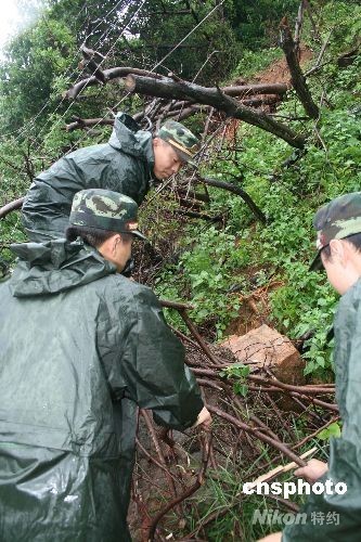七月三十日,福建泉州邊防支隊官兵在福建泉州一山體滑坡路段清理路障。受第八號臺風“鳳凰”過境帶來的暴風雨天氣影響,泉州市泉港區(qū)南埔鎮(zhèn)一路段發(fā)生山體滑坡。中新社發(fā) 李實 攝