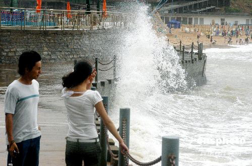 2008年7月30日,江蘇連云港由于受今年第8號(hào)臺(tái)風(fēng)“鳳凰”的外圍影響,海域風(fēng)力大增,沿海風(fēng)力達(dá)到8--9級(jí),洶涌的海浪與岸邊的礁石相撞擊,卷起層層浪花。當(dāng)?shù)貧庀笈_(tái)已發(fā)布防臺(tái)警報(bào)。中新社發(fā) 王春 攝