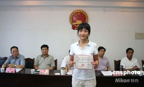 2008年8月1日上午,心理咨詢師張帆向大家展示人民陪審員證書。當(dāng)天,經(jīng)鄭州市二七區(qū)人民法院院長靳風(fēng)英提請,鄭州市二七區(qū)第十四屆人大常委會第九次會議通過,任命共青團(tuán)鄭州市委12355青少年維權(quán)及心理咨詢中心主任袁林方及心理咨詢師張帆,為鄭州市二七區(qū)人民法院少年刑事審判庭人民陪審員,這也意味著該兩名心理咨詢師從此在刑事審判中擁有了人民陪審員的審判職能。中新社發(fā) 王中舉 攝