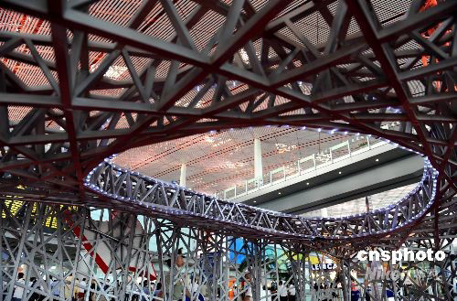 8月12日,北京首都機(jī)場(chǎng)T3航站樓搭建一處類似于“鳥巢”體育館的景觀,歡迎奧運(yùn)賓朋。 中新社發(fā) 廖攀 攝
