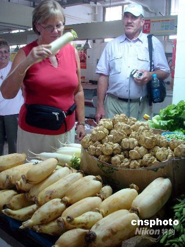 2008年9月1日,外國游人在蘇州雙塔菜場游覽。如今到蘇州旅游的外國游人越來越多,他們在游覽古典園林的同時(shí),蘇州的菜市場也成為“老外”游客游覽的新景點(diǎn)。市場內(nèi)豐富的農(nóng)產(chǎn)品和當(dāng)?shù)匕傩丈钗恕袄贤狻眰兊哪抗狻V行律绨l(fā) 王建康 攝