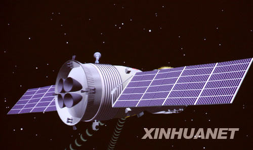 這是神舟七號(hào)載人飛船在太空遨游的模擬圖(9月27日10時(shí)06分44秒攝于北京航天飛行控制中心)。 新華社記者 陳建力 攝