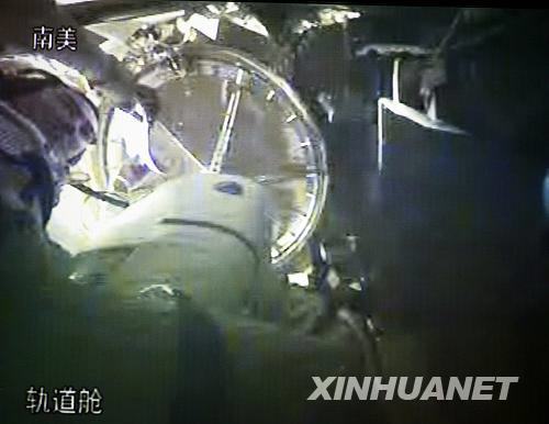 9月27日,航天員翟志剛在神舟七號(hào)載人飛船軌道艙進(jìn)行出艙前的準(zhǔn)備工作(攝于北京航天飛行控制中心大屏幕)。當(dāng)日中午,航天員出艙活動(dòng)任務(wù)開始。新華社記者查春明攝
