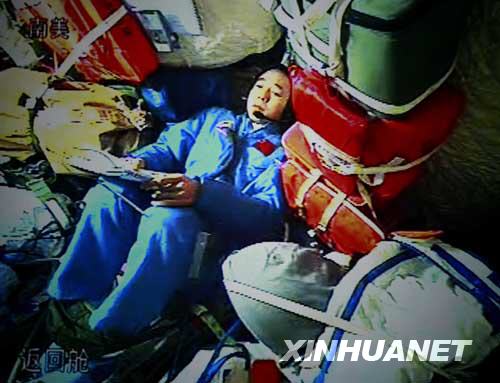 9月27日,航天員景海鵬在神舟七號(hào)載人飛船返回艙與地面通話(攝于北京航天飛行控制中心大屏幕)。當(dāng)日中午,航天員出艙活動(dòng)任務(wù)開始。新華社記者查春明攝