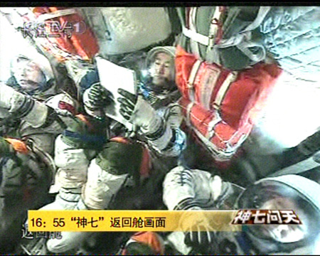 北京時(shí)間9月28日下午16時(shí)55分許,神舟七號(hào)三名航天員即將返回地球,他們已經(jīng)穿好艙內(nèi)航天服,神態(tài)安詳平靜。