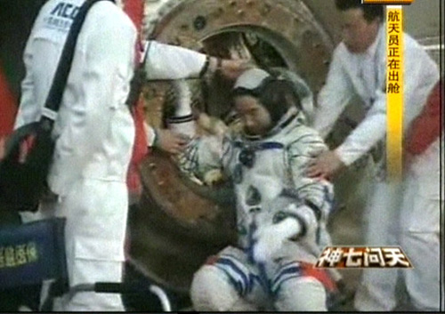 9月28日,神舟七號飛船返回艙順利著落,三名航天員翟志剛、劉伯明、景海鵬在經(jīng)過15-20分鐘的重力再適應(yīng)后全部出艙。首先出艙的是翟志剛,第二個出艙的是劉伯明,第三個出艙的是景海鵬。