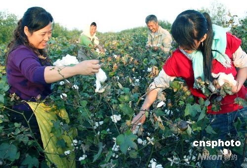 2008年10月3日,在縣城工作的兩位女士(前排)在幫助山東省無(wú)棣縣西小王鄉(xiāng)河北村的棉農(nóng)拾棉花。無(wú)棣縣是全國(guó)優(yōu)質(zhì)棉生產(chǎn)基地,“十一”黃金周期間,正是棉花收獲的季節(jié),拾花工奇缺,不少城里人瞅準(zhǔn)商機(jī),利用“十一”黃金周為當(dāng)?shù)孛揶r(nóng)打工拾棉花,在分享體驗(yàn)棉花豐收快樂(lè)、感受拾棉樂(lè)趣的同時(shí),每天還有近百元的收益。中新社發(fā) 陳子慶 攝