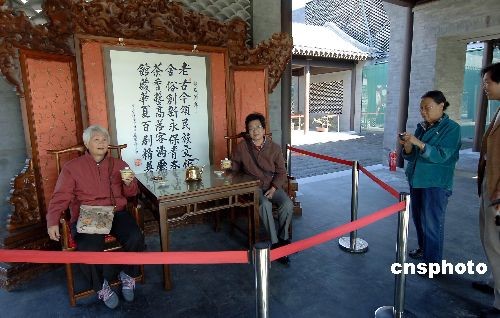 10月10日,免費(fèi)進(jìn)入北京奧林匹克公園及老舍茶館“瓦院”參觀的游客,反客為主,在這座北京三進(jìn)制四合院中,東坐坐、西坐坐,并在正堂上就座拍照留影,感受老北京文化。中新社發(fā) 鄒憲 攝