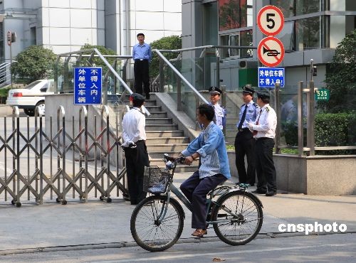 圖為上海高院門口安檢森嚴(yán),吸引騎車路人張望。