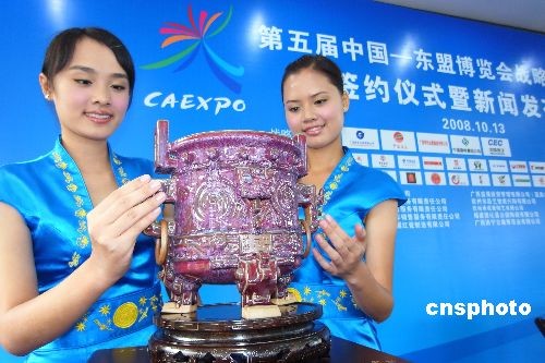 10月13日,由河南禹州孔家鈞窯燒制的2008中國—東盟博覽會鈞瓷國禮《象天鼎》運(yùn)抵廣西南寧,作品由中國工藝美術(shù)大師孔相卿設(shè)計,以中國古老的青銅禮器“鼎”為基本造型設(shè)計制作,表達(dá)了中國與東盟國家互利合作、共享繁榮的美好愿望。據(jù)悉,第五屆中國—東盟博覽會將于10月22日—25日在中國廣西南寧舉行,《象天鼎》將作為國禮,贈送給參加博覽會的各國政要。中新社發(fā) 牛書培 攝
