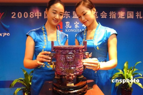 10月14日,廣西南寧舉行的中國(guó)—東盟博覽會(huì)新聞發(fā)布會(huì)宣布,產(chǎn)于河南禹州孔家鈞窯的鈞瓷《象天鼎》被確定為第五屆中國(guó)—東盟博覽會(huì)國(guó)禮!断筇於Α酚芍袊(guó)工藝美術(shù)大師孔相卿設(shè)計(jì),以中國(guó)古老的青銅禮器“鼎”為基本造型設(shè)計(jì)制作,表達(dá)了中國(guó)與東盟國(guó)家互利合作、共享繁榮的美好愿望。中新社發(fā) 牛書培 攝